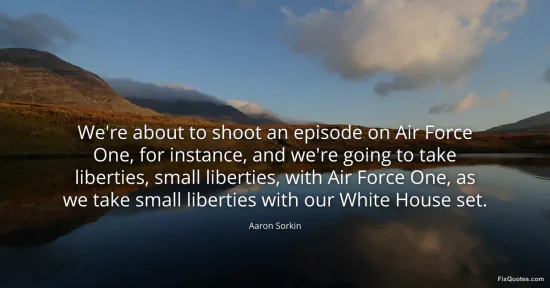 Sorkin, Aaron. (2026, January 17). We're about to shoot an episode on Air Force One, for instance, and we're going to take liberties, small liberties, with Air Force One, as we take small liberties with our White House set. FixQuotes. https://fixquotes.com/quotes/were-about-to-shoot-an-episode-on-air-force-one-56844/