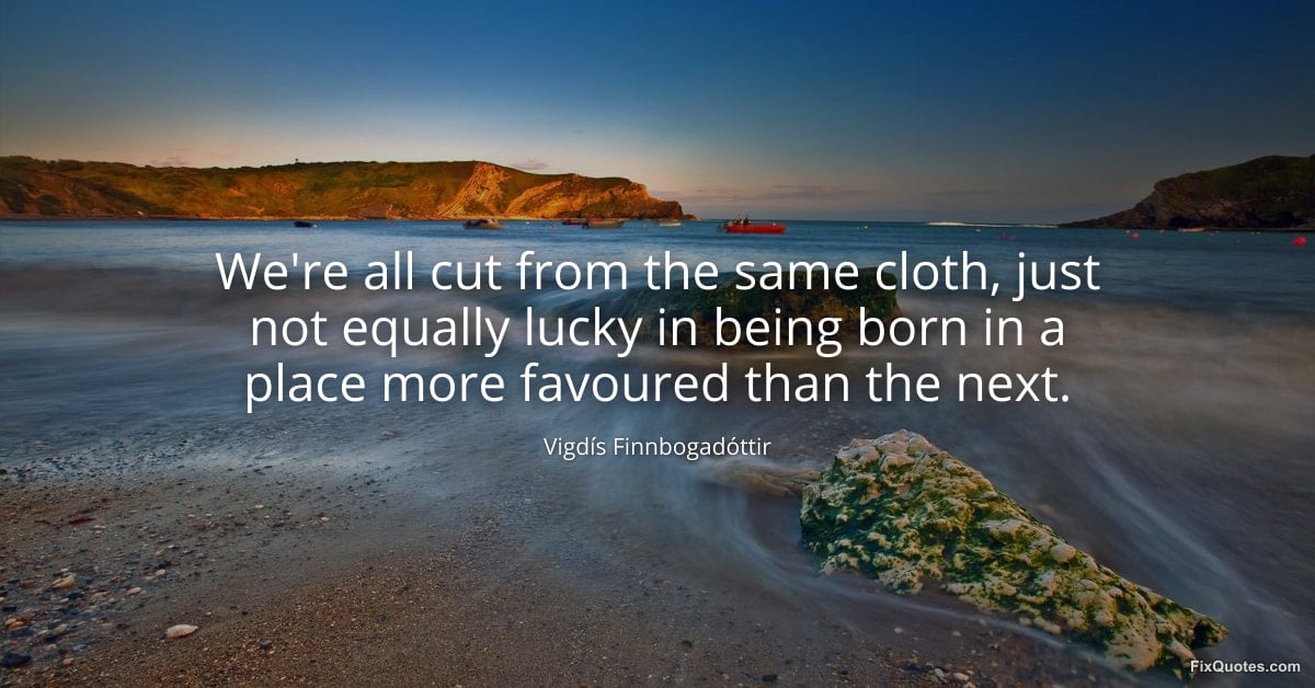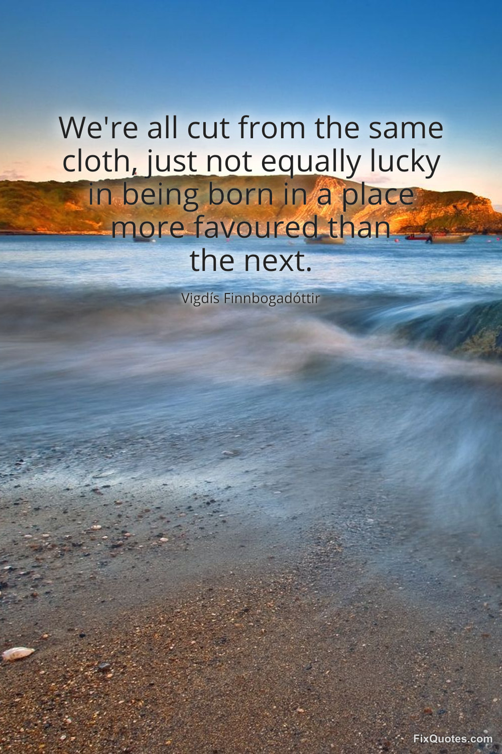 Finnbogadóttir, Vigdís. (2026, February 16). We're all cut from the same cloth, just not equally lucky in being born in a place more favoured than the next. FixQuotes. https://fixquotes.com/quotes/were-all-cut-from-the-same-cloth-just-not-equally-185416/