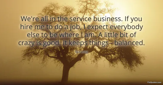 Long, Nia. "We're all in the service business. If you hire me to do a job, I expect everybody else to be where I am. A little bit of crazy is good. It keeps things - balanced." FixQuotes. February 18, 2026. https://fixquotes.com/quotes/were-all-in-the-service-business-if-you-hire-me-105709/.