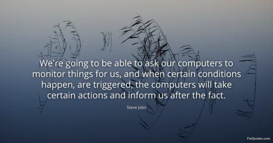 Jobs, Steve. "We're going to be able to ask our computers to monitor things for us, and when certain conditions happen, are triggered, the computers will take certain actions and inform us after the fact." FixQuotes. January 15, 2026. https://fixquotes.com/quotes/were-going-to-be-able-to-ask-our-computers-to-41976/.