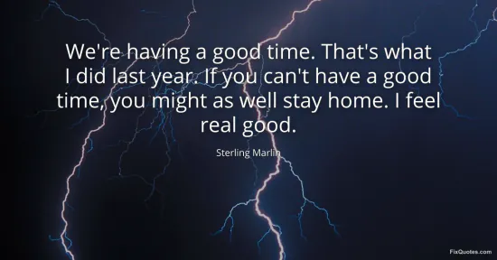 Marlin, Sterling. "We're having a good time. That's what I did last year. If you can't have a good time, you might as well stay home. I feel real good." FixQuotes. January 15, 2026. https://fixquotes.com/quotes/were-having-a-good-time-thats-what-i-did-last-169721/.
