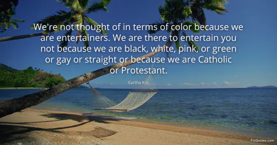 Kitt, Eartha. (2026, January 17). We're not thought of in terms of color because we are entertainers. We are there to entertain you not because we are black, white, pink, or green or gay or straight or because we are Catholic or Protestant. FixQuotes. https://fixquotes.com/quotes/were-not-thought-of-in-terms-of-color-because-we-55023/