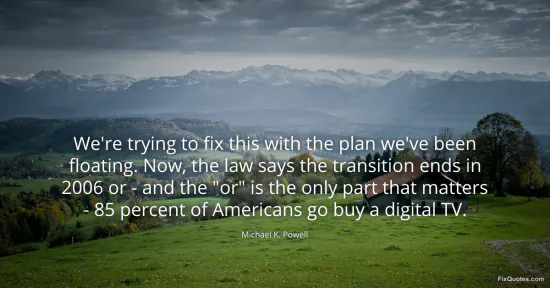 Powell, Michael K. "We're trying to fix this with the plan we've been floating. Now, the law says the transition ends in 2006 or - and the "or" is the only part that matters - 85 percent of Americans go buy a digital TV." FixQuotes. January 16, 2026. https://fixquotes.com/quotes/were-trying-to-fix-this-with-the-plan-weve-been-108225/.
