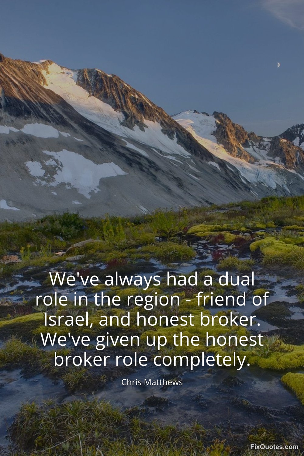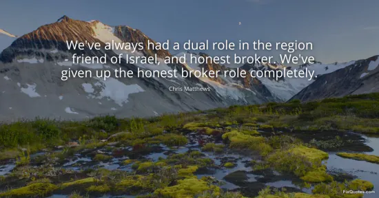 Matthews, Chris. (2026, January 17). We've always had a dual role in the region - friend of Israel, and honest broker. We've given up the honest broker role completely. FixQuotes. https://fixquotes.com/quotes/weve-always-had-a-dual-role-in-the-region-67172/