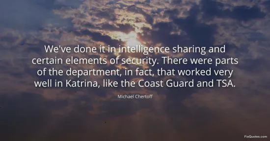 Chertoff, Michael. (2026, January 16). We've done it in intelligence sharing and certain elements of security. There were parts of the department, in fact, that worked very well in Katrina, like the Coast Guard and TSA. FixQuotes. https://fixquotes.com/quotes/weve-done-it-in-intelligence-sharing-and-certain-93337/