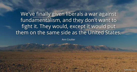 Coulter, Ann. "We've finally given liberals a war against fundamentalism, and they don't want to fight it. They would, except it would put them on the same side as the United States." FixQuotes. January 17, 2026. https://fixquotes.com/quotes/weve-finally-given-liberals-a-war-against-32978/.