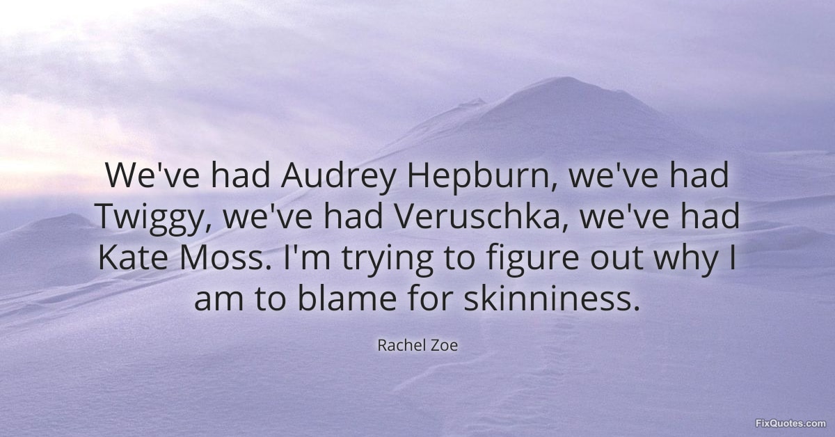 Zoe, Rachel. (2026, January 18). We've had Audrey Hepburn, we've had Twiggy, we've had Veruschka, we've had Kate Moss. I'm trying to figure out why I am to blame for skinniness. FixQuotes. https://fixquotes.com/quotes/weve-had-audrey-hepburn-weve-had-twiggy-weve-had-12139/