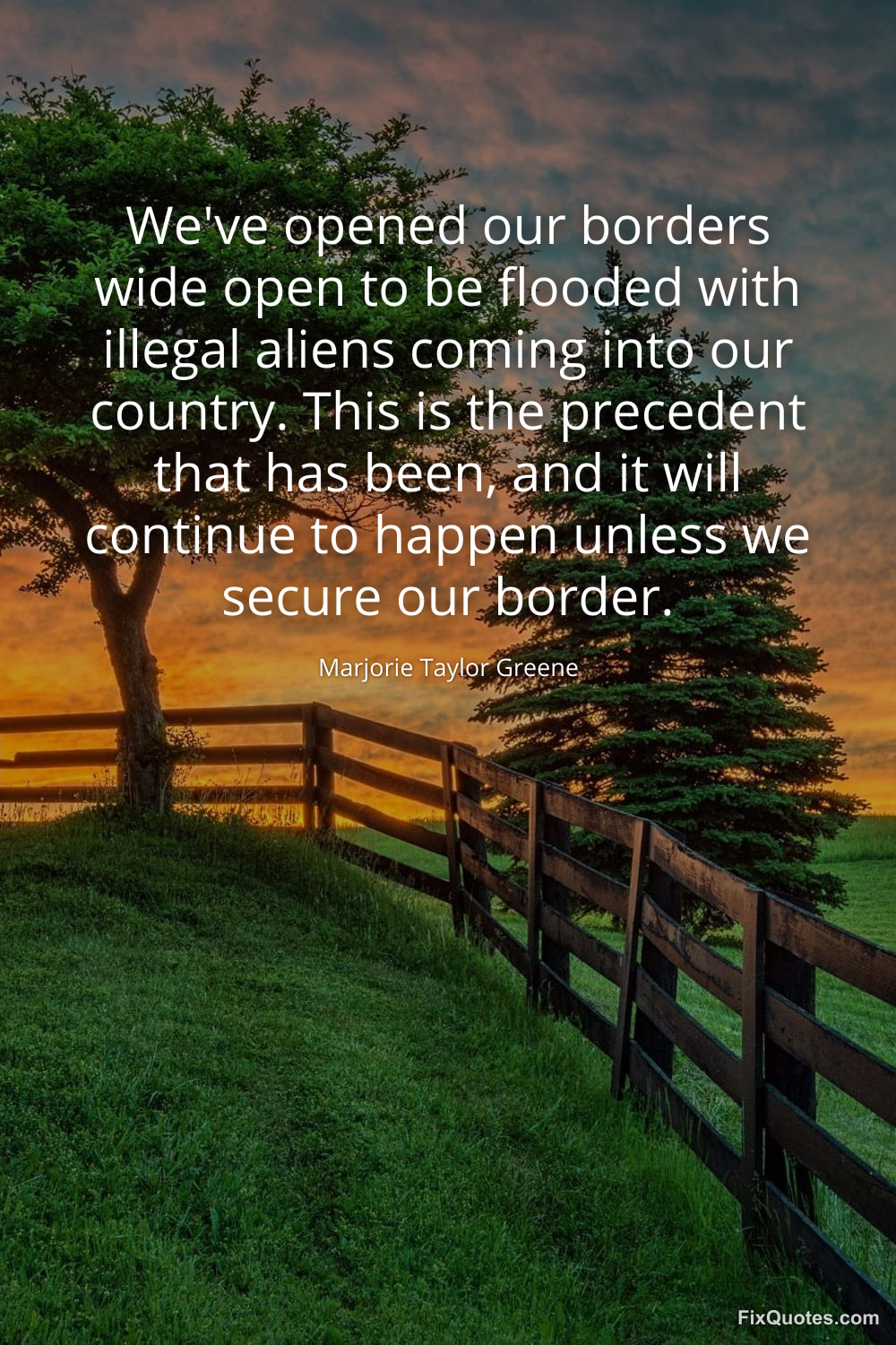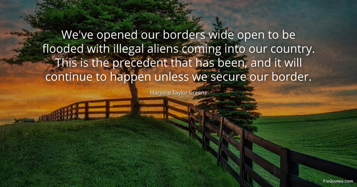 Greene, Marjorie Taylor. (2026, January 15). We've opened our borders wide open to be flooded with illegal aliens coming into our country. This is the precedent that has been, and it will continue to happen unless we secure our border. FixQuotes. https://fixquotes.com/quotes/weve-opened-our-borders-wide-open-to-be-flooded-173549/