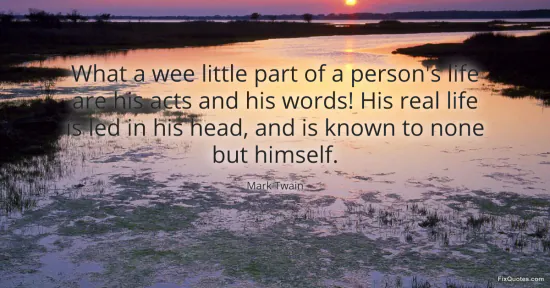 Twain, Mark. "What a wee little part of a person's life are his acts and his words! His real life is led in his head, and is known to none but himself." FixQuotes. January 18, 2026. https://fixquotes.com/quotes/what-a-wee-little-part-of-a-persons-life-are-his-22272/.