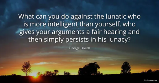 Orwell, George. (2026, January 15). What can you do against the lunatic who is more intelligent than yourself, who gives your arguments a fair hearing and then simply persists in his lunacy? FixQuotes. https://fixquotes.com/quotes/what-can-you-do-against-the-lunatic-who-is-more-36217/