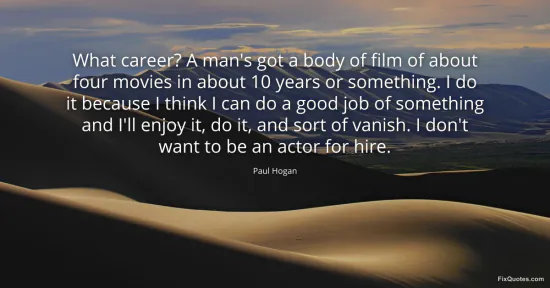Hogan, Paul. (2026, January 16). What career? A man's got a body of film of about four movies in about 10 years or something. I do it because I think I can do a good job of something and I'll enjoy it, do it, and sort of vanish. I don't want to be an actor for hire. FixQuotes. https://fixquotes.com/quotes/what-career-a-mans-got-a-body-of-film-of-about-115061/