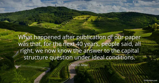 Miller, Merton. "What happened after publication of our paper was that, for the next 40 years, people said, all right, we now know the answer to the capital structure question under ideal conditions." FixQuotes. January 17, 2026. https://fixquotes.com/quotes/what-happened-after-publication-of-our-paper-was-82013/.