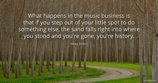 Sinatra, Nancy. "What happens in the music business is that if you step out of your little spot to do something else, the sand falls right into where you stood and you're gone, you're history." FixQuotes. January 15, 2026. https://fixquotes.com/quotes/what-happens-in-the-music-business-is-that-if-you-151092/.