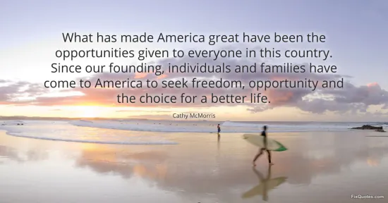 McMorris, Cathy. "What has made America great have been the opportunities given to everyone in this country. Since our founding, individuals and families have come to America to seek freedom, opportunity and the choice for a better life." FixQuotes. January 17, 2026. https://fixquotes.com/quotes/what-has-made-america-great-have-been-the-40573/.