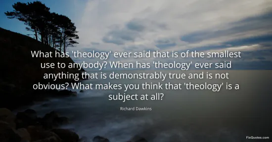 Dawkins, Richard. "What has 'theology' ever said that is of the smallest use to anybody? When has 'theology' ever said anything that is demonstrably true and is not obvious? What makes you think that 'theology' is a subject at all?" FixQuotes. January 18, 2026. https://fixquotes.com/quotes/what-has-theology-ever-said-that-is-of-the-20427/.
