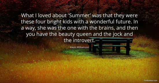 Williamson, Kevin. (2026, January 16). What I loved about 'Summer' was that they were these four bright kids with a wonderful future. In a way, she was the one with the brains, and then you have the beauty queen and the jock and the introvert. FixQuotes. https://fixquotes.com/quotes/what-i-loved-about-summer-was-that-they-were-127088/