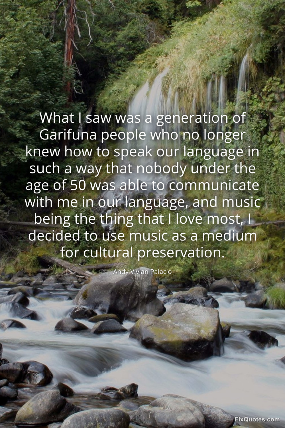 Palacio, Andy Vivian. "What I saw was a generation of Garifuna people who no longer knew how to speak our language in such a way that nobody under the age of 50 was able to communicate with me in our language, and music being the thing that I love most, I decided to use music as a medium for cultural preservation." FixQuotes. February 16, 2026. https://fixquotes.com/quotes/what-i-saw-was-a-generation-of-garifuna-people-185535/.