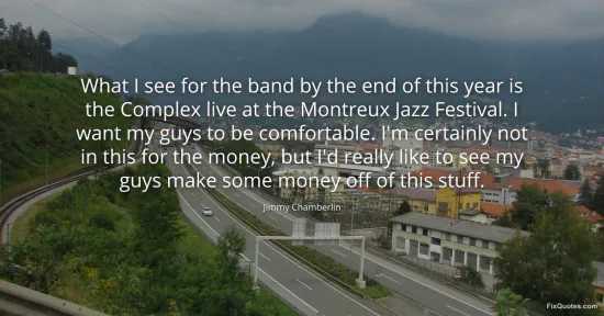 Chamberlin, Jimmy. (2026, January 16). What I see for the band by the end of this year is the Complex live at the Montreux Jazz Festival. I want my guys to be comfortable. I'm certainly not in this for the money, but I'd really like to see my guys make some money off of this stuff. FixQuotes. https://fixquotes.com/quotes/what-i-see-for-the-band-by-the-end-of-this-year-92605/