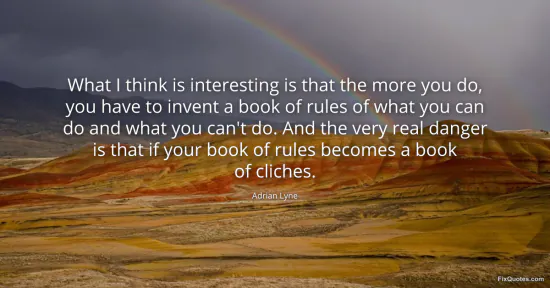 Lyne, Adrian. (2026, January 18). What I think is interesting is that the more you do, you have to invent a book of rules of what you can do and what you can't do. And the very real danger is that if your book of rules becomes a book of cliches. FixQuotes. https://fixquotes.com/quotes/what-i-think-is-interesting-is-that-the-more-you-3620/