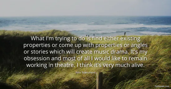 Townshend, Pete. "What I'm trying to do is find either existing properties or come up with properties or angles or stories which will create music drama. It's my obsession and most of all I would like to remain working in theatre. I think it's very much alive." FixQuotes. January 17, 2026. https://fixquotes.com/quotes/what-im-trying-to-do-is-find-either-existing-80525/.