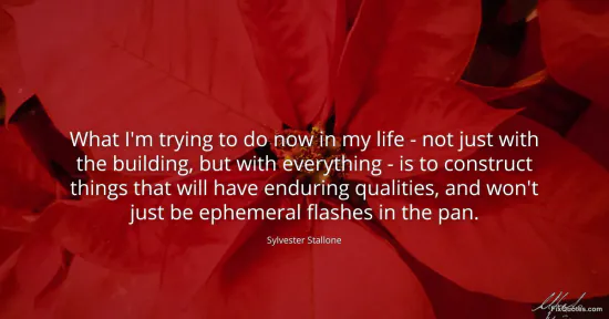 Stallone, Sylvester. "What I'm trying to do now in my life - not just with the building, but with everything - is to construct things that will have enduring qualities, and won't just be ephemeral flashes in the pan." FixQuotes. January 16, 2026. https://fixquotes.com/quotes/what-im-trying-to-do-now-in-my-life-not-just-97981/.