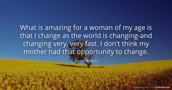 Moreau, Jeanne. "What is amazing for a woman of my age is that I change as the world is changing-and changing very, very fast. I don't think my mother had that opportunity to change." FixQuotes. January 17, 2026. https://fixquotes.com/quotes/what-is-amazing-for-a-woman-of-my-age-is-that-i-53721/.