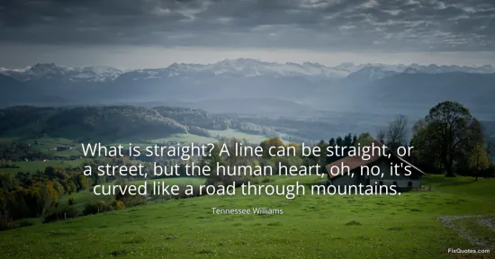 Williams, Tennessee. "What is straight? A line can be straight, or a street, but the human heart, oh, no, it's curved like a road through mountains." FixQuotes. January 15, 2026. https://fixquotes.com/quotes/what-is-straight-a-line-can-be-straight-or-a-10122/.
