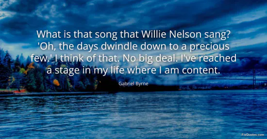 Byrne, Gabriel. (2026, January 15). What is that song that Willie Nelson sang? 'Oh, the days dwindle down to a precious few.' I think of that. No big deal. I've reached a stage in my life where I am content. FixQuotes. https://fixquotes.com/quotes/what-is-that-song-that-willie-nelson-sang-oh-the-91642/