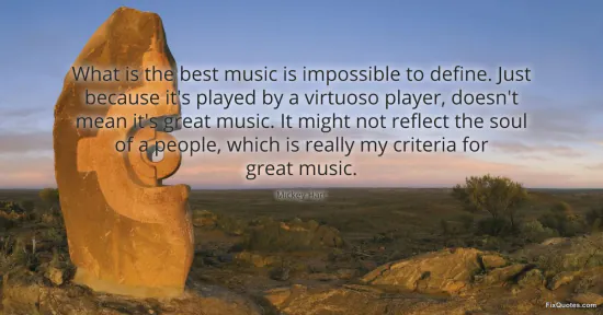 "What is the best music is impossible to define. Just because it's played by a virtuoso player, doesn't mean it's great music. It might not reflect the soul of a people, which is really my criteria for great music." FixQuotes, 17 Jan. 2026, https://fixquotes.com/quotes/what-is-the-best-music-is-impossible-to-define-70498/. Accessed 12 Feb. 2026.