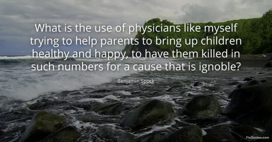 Spock, Benjamin. (2026, January 16). What is the use of physicians like myself trying to help parents to bring up children healthy and happy, to have them killed in such numbers for a cause that is ignoble? FixQuotes. https://fixquotes.com/quotes/what-is-the-use-of-physicians-like-myself-trying-139258/
