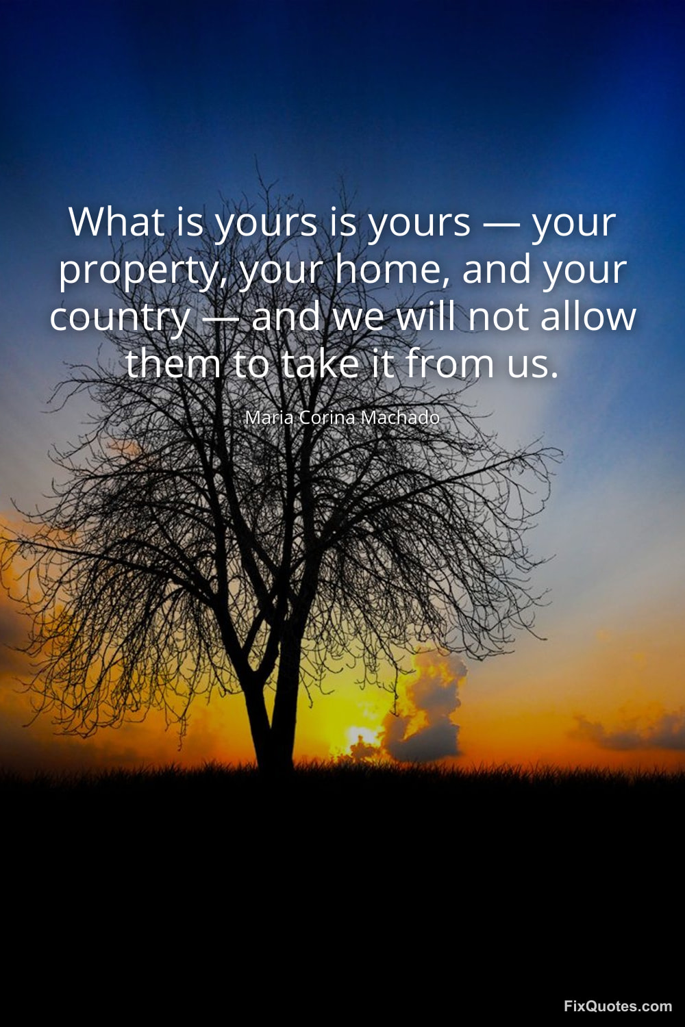 Machado, Maria Corina. (2026, January 11). What is yours is yours — your property, your home, and your country — and we will not allow them to take it from us. FixQuotes. https://fixquotes.com/quotes/what-is-yours-is-yours-your-property-your-home-173709/