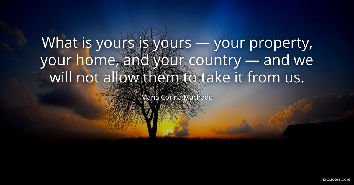 Machado, Maria Corina. "What is yours is yours — your property, your home, and your country — and we will not allow them to take it from us." FixQuotes. January 11, 2026. https://fixquotes.com/quotes/what-is-yours-is-yours-your-property-your-home-173709/.