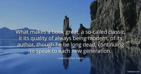 Powell, Lawrence Clark. "What makes a book great, a so-called classic, it its quality of always being modern, of its author, though he be long dead, continuing to speak to each new generation." FixQuotes. January 16, 2026. https://fixquotes.com/quotes/what-makes-a-book-great-a-so-called-classic-it-135208/.