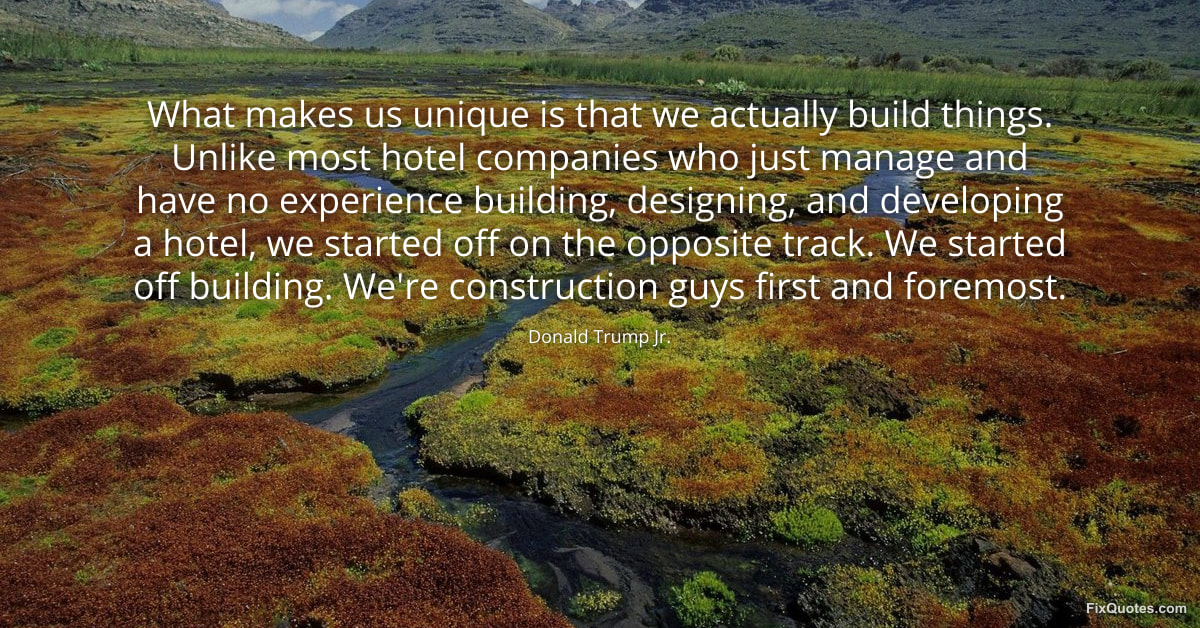 Jr., Donald Trump. (2026, January 15). What makes us unique is that we actually build things. Unlike most hotel companies who just manage and have no experience building, designing, and developing a hotel, we started off on the opposite track. We started off building. We're construction guys first and foremost. FixQuotes. https://fixquotes.com/quotes/what-makes-us-unique-is-that-we-actually-build-173273/