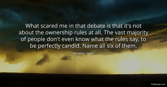 Powell, Michael K. (2026, January 16). What scared me in that debate is that it's not about the ownership rules at all. The vast majority of people don't even know what the rules say, to be perfectly candid. Name all six of them. FixQuotes. https://fixquotes.com/quotes/what-scared-me-in-that-debate-is-that-its-not-115759/