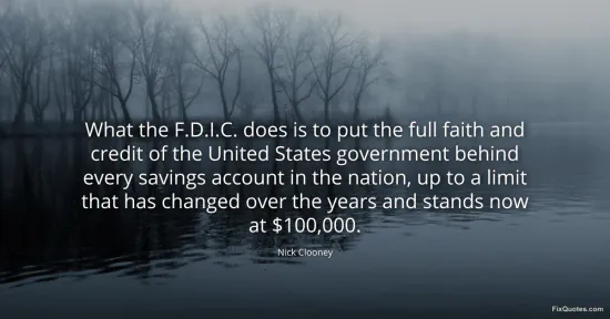 Clooney, Nick. "What the F.D.I.C. does is to put the full faith and credit of the United States government behind every savings account in the nation, up to a limit that has changed over the years and stands now at $100,000." FixQuotes. January 15, 2026. https://fixquotes.com/quotes/what-the-fdic-does-is-to-put-the-full-faith-and-116414/.