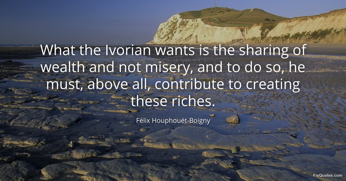 "What the Ivorian wants is the sharing of wealth and not misery, and to do so, he must, above all, contribute to creating these riches." FixQuotes, 17 Feb. 2026, https://fixquotes.com/quotes/what-the-ivorian-wants-is-the-sharing-of-wealth-185593/. Accessed 17 Feb. 2026.