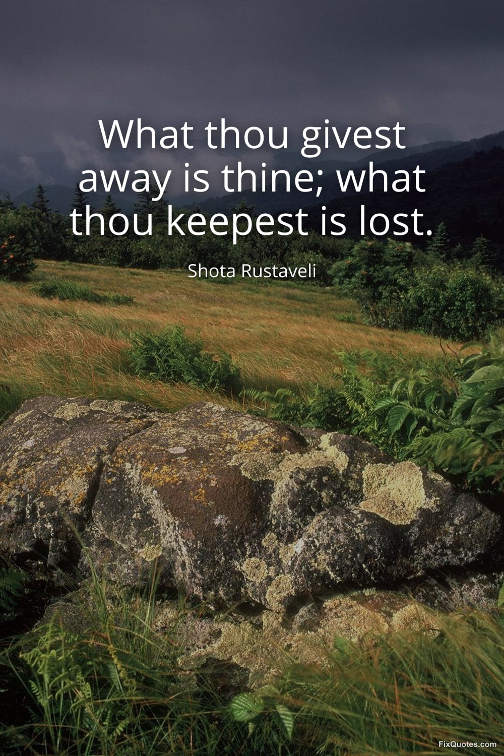 Rustaveli, Shota. (2026, February 23). What thou givest away is thine; what thou keepest is lost. FixQuotes. https://fixquotes.com/quotes/what-thou-givest-away-is-thine-what-thou-keepest-185651/