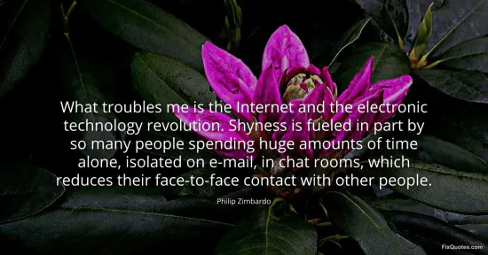 Zimbardo, Philip. "What troubles me is the Internet and the electronic technology revolution. Shyness is fueled in part by so many people spending huge amounts of time alone, isolated on e-mail, in chat rooms, which reduces their face-to-face contact with other people." FixQuotes. January 16, 2026. https://fixquotes.com/quotes/what-troubles-me-is-the-internet-and-the-94647/.