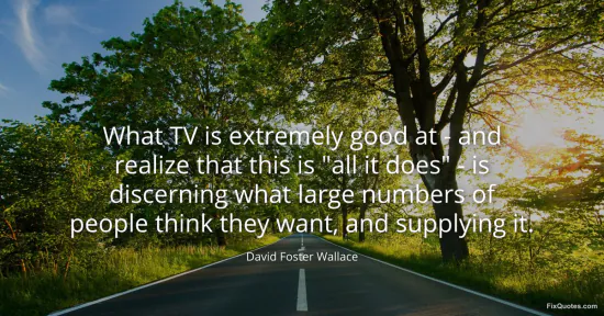 Wallace, David Foster. (2026, January 15). What TV is extremely good at - and realize that this is "all it does" - is discerning what large numbers of people think they want, and supplying it. FixQuotes. https://fixquotes.com/quotes/what-tv-is-extremely-good-at-and-realize-that-141347/