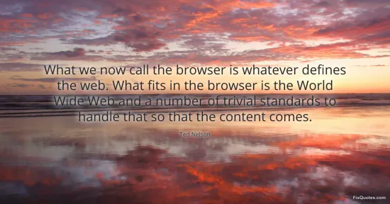 Nelson is doing that very Ted Nelson thing: naming the trap while you are still admiring the cheese. By declaring the browser "whatever defines the web", he flips the usual story of neutral tools delivering an independent medium. The subtext is blunt: the browser is not a window onto the web; it is the constitution of the web. If you control the browser, you control what "the web" even is.