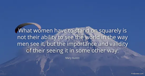 Austin, Mary. "What women have to stand on squarely is not their ability to see the world in the way men see it, but the importance and validity of their seeing it in some other way." FixQuotes. January 15, 2026. https://fixquotes.com/quotes/what-women-have-to-stand-on-squarely-is-not-their-93406/.