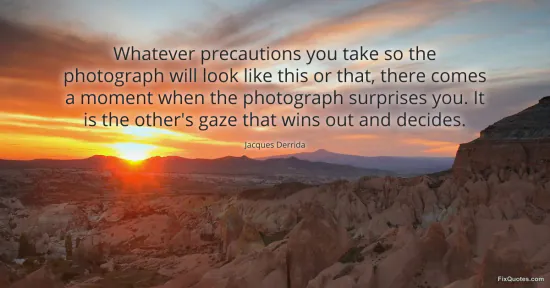 Derrida, Jacques. "Whatever precautions you take so the photograph will look like this or that, there comes a moment when the photograph surprises you. It is the other's gaze that wins out and decides." FixQuotes. January 17, 2026. https://fixquotes.com/quotes/whatever-precautions-you-take-so-the-photograph-24301/.