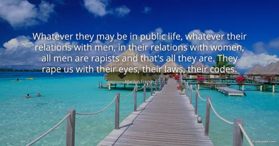 French, Marilyn. (2026, January 14). Whatever they may be in public life, whatever their relations with men, in their relations with women, all men are rapists and that's all they are. They rape us with their eyes, their laws, their codes. FixQuotes. https://fixquotes.com/quotes/whatever-they-may-be-in-public-life-whatever-71083/