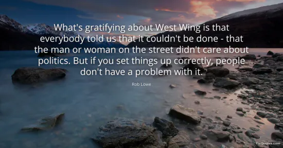 Lowe, Rob. "What's gratifying about West Wing is that everybody told us that it couldn't be done - that the man or woman on the street didn't care about politics. But if you set things up correctly, people don't have a problem with it." FixQuotes. January 15, 2026. https://fixquotes.com/quotes/whats-gratifying-about-west-wing-is-that-102571/.