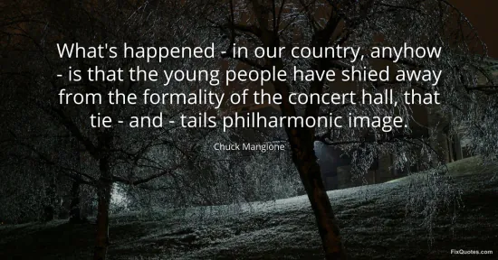 Mangione, Chuck. (2026, January 17). What's happened - in our country, anyhow - is that the young people have shied away from the formality of the concert hall, that tie - and - tails philharmonic image. FixQuotes. https://fixquotes.com/quotes/whats-happened-in-our-country-anyhow-is-that-72616/