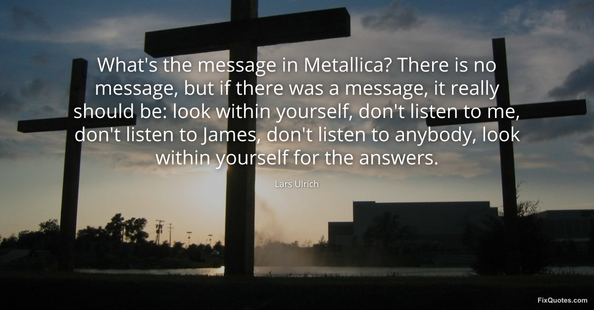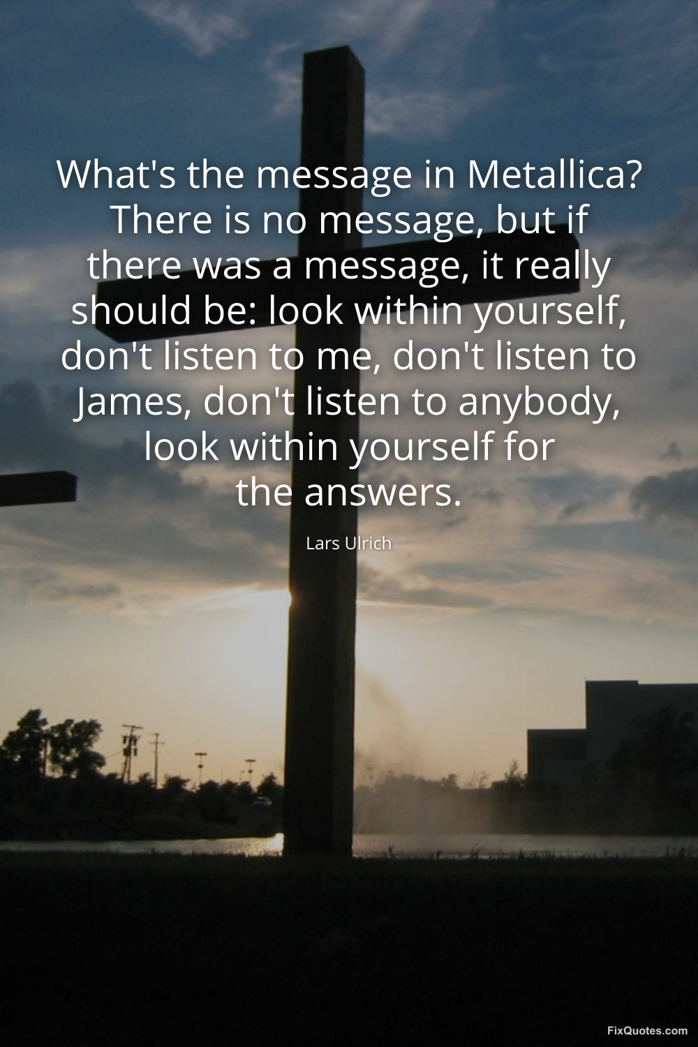 Ulrich, Lars. (2026, February 17). What's the message in Metallica? There is no message, but if there was a message, it really should be: look within yourself, don't listen to me, don't listen to James, don't listen to anybody, look within yourself for the answers. FixQuotes. https://fixquotes.com/quotes/whats-the-message-in-metallica-there-is-no-104244/
