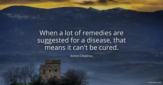 Chekhov, Anton. (2026, January 17). When a lot of remedies are suggested for a disease, that means it can't be cured. FixQuotes. https://fixquotes.com/quotes/when-a-lot-of-remedies-are-suggested-for-a-36996/