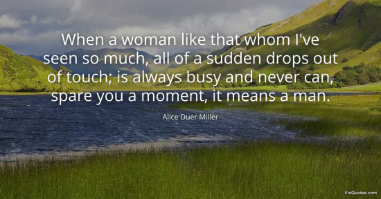 Miller, Alice Duer. "When a woman like that whom I've seen so much, all of a sudden drops out of touch; is always busy and never can, spare you a moment, it means a man." FixQuotes. February 16, 2026. https://fixquotes.com/quotes/when-a-woman-like-that-whom-ive-seen-so-much-all-162583/.
