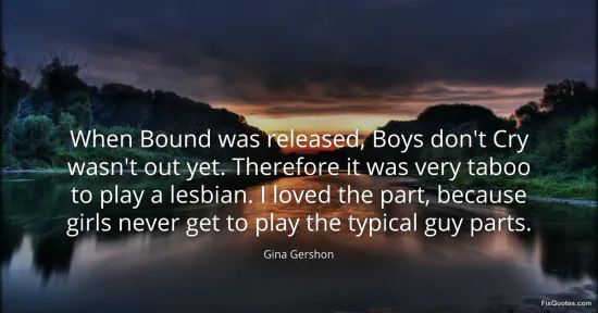 Gershon, Gina. (2026, January 17). When Bound was released, Boys don't Cry wasn't out yet. Therefore it was very taboo to play a lesbian. I loved the part, because girls never get to play the typical guy parts. FixQuotes. https://fixquotes.com/quotes/when-bound-was-released-boys-dont-cry-wasnt-out-53118/